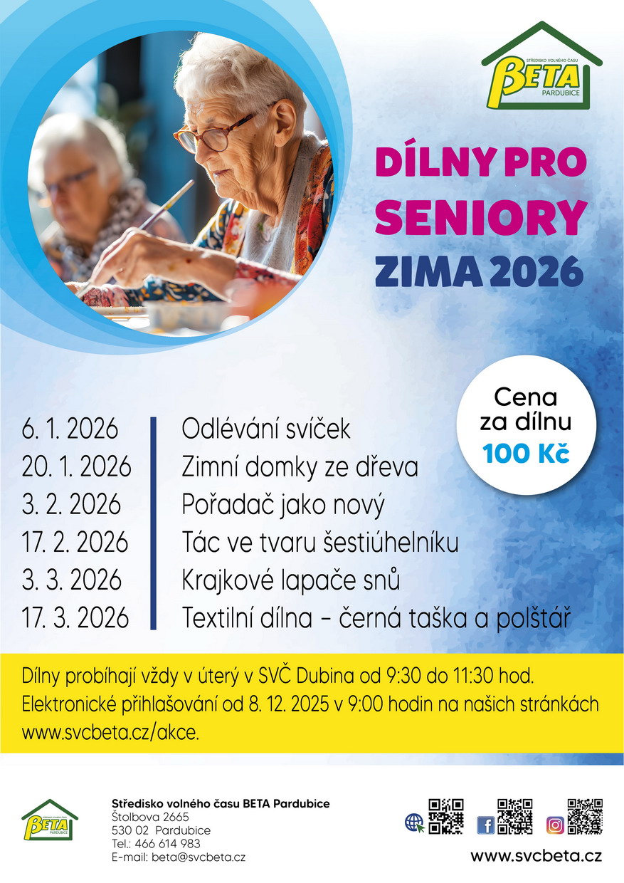 Tvůrčí dopolední dílny pro seniory, kde si v vyzkoušíte řadu tradičních i netradičních výtvarných technik a vytvoříte si tak neobvyklou dekoraci do svých domovů. Tyto workshopy pořádáme ve spolupráci s oddělením kultury a cestovního ruchu odboru školství, kultury a sportu Magistrátu města Pardubice.